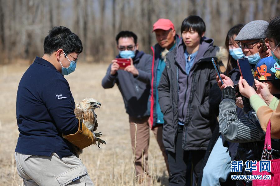 3月20日,北京猛禽救助中心猛禽康復師周蕾在放飛大鵟前向參加放飛活動的人員進行講解、展示。新華社記者 李京 攝