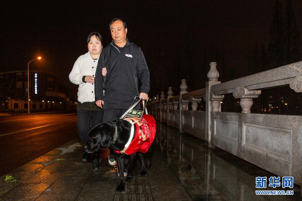 4月11日晚,妻子挽著吳虎剛,吳虎剛牽著“C羅”,共同走在下班回家的路上?! ⌒氯A社發 (張夢 攝)