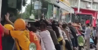 抬公交車救人