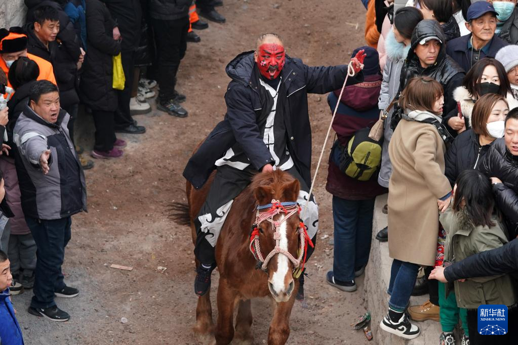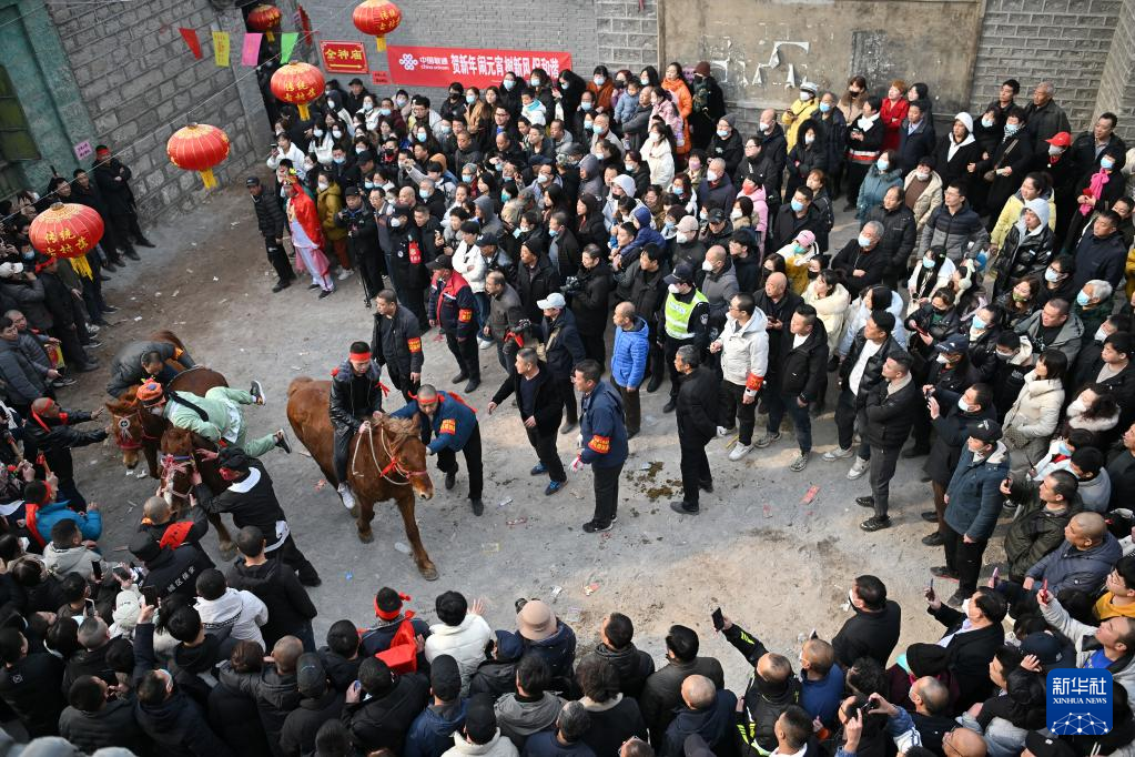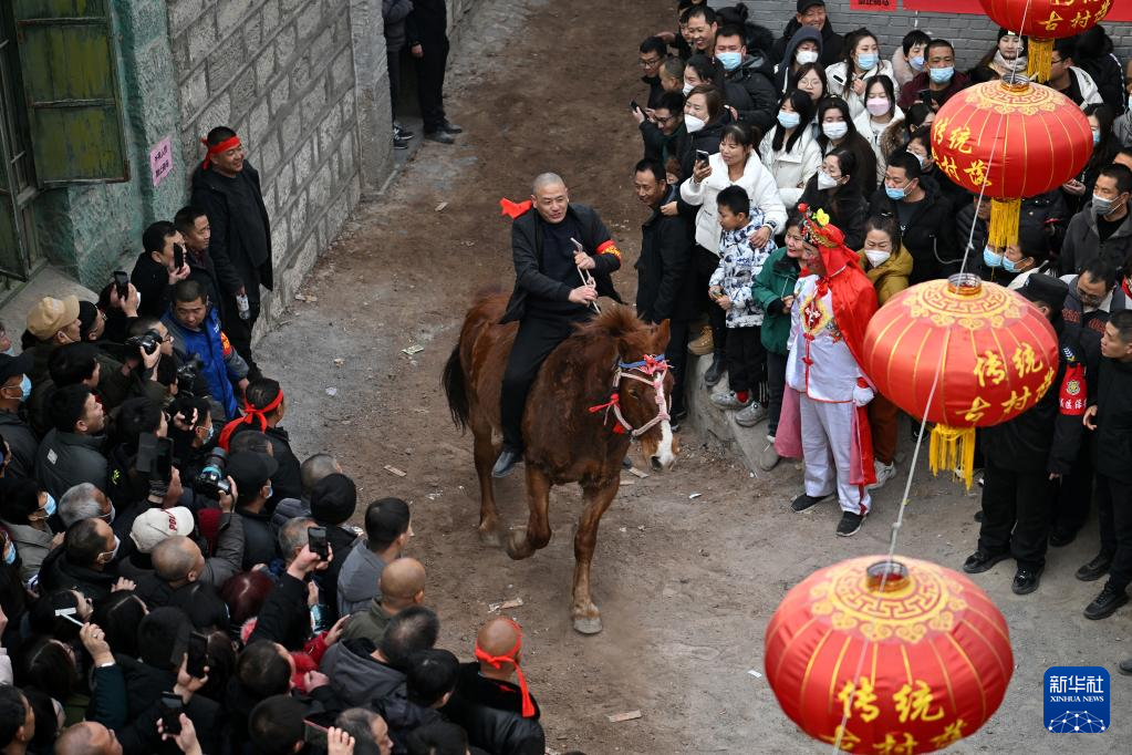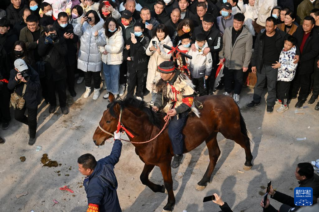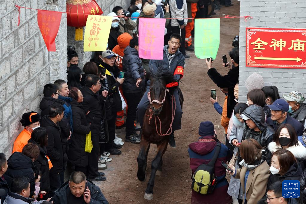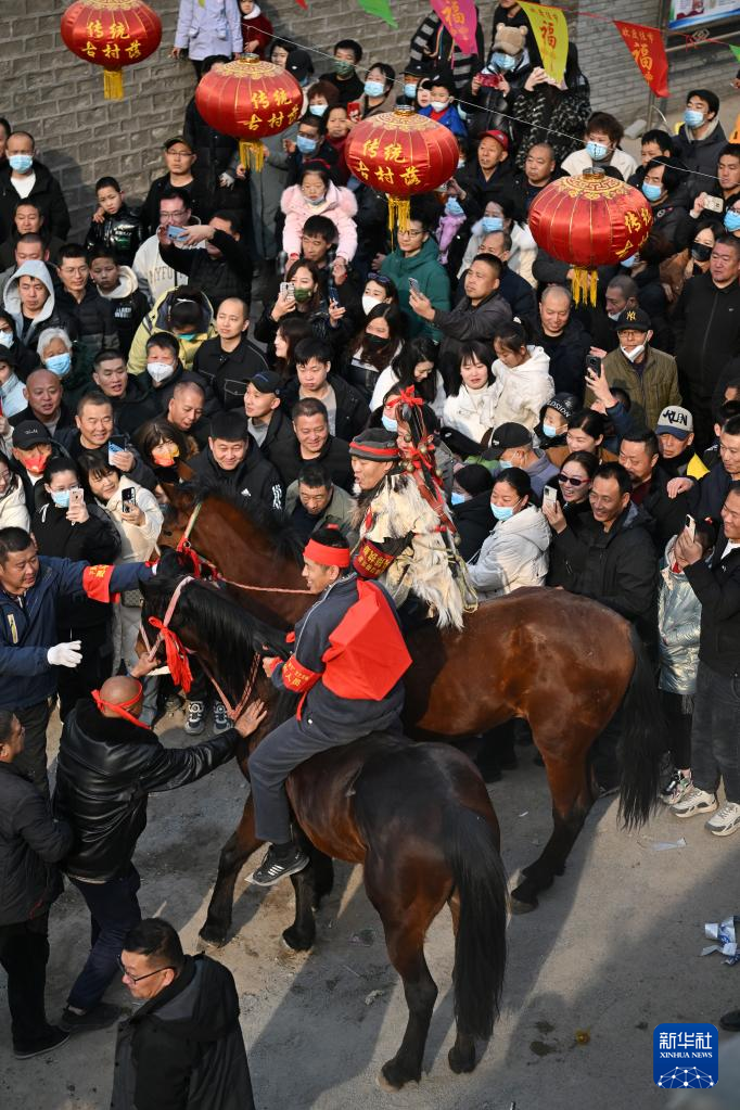當日是農歷正月十六,山西省陽泉市平定縣下董寨村熱鬧非凡,當地特有的民俗活動——“跑馬排”上演,村民騎著馬在古巷里來回飛奔,吸引眾多游客觀看。