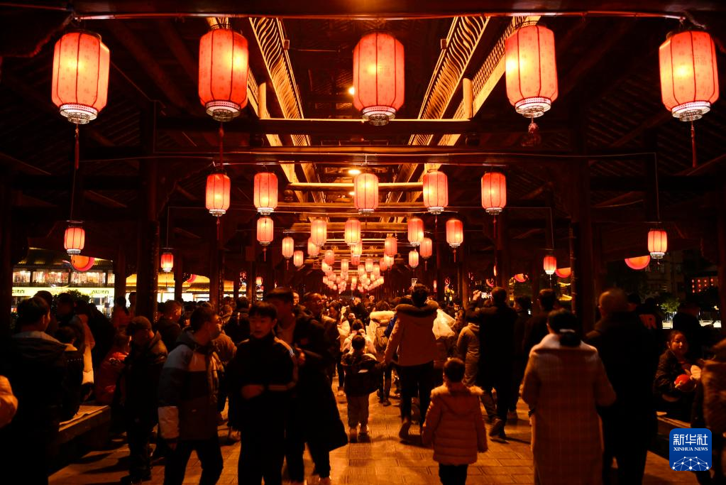 2月5日晚,湖北省宣恩縣仙山貢水旅游區的風雨橋上人潮涌動。