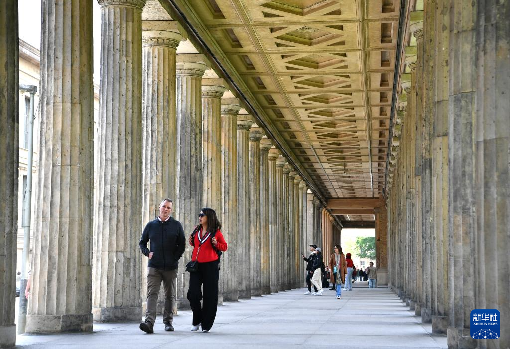 5月16日,在德國柏林博物館島,人們經過老國家美術館前的長廊。