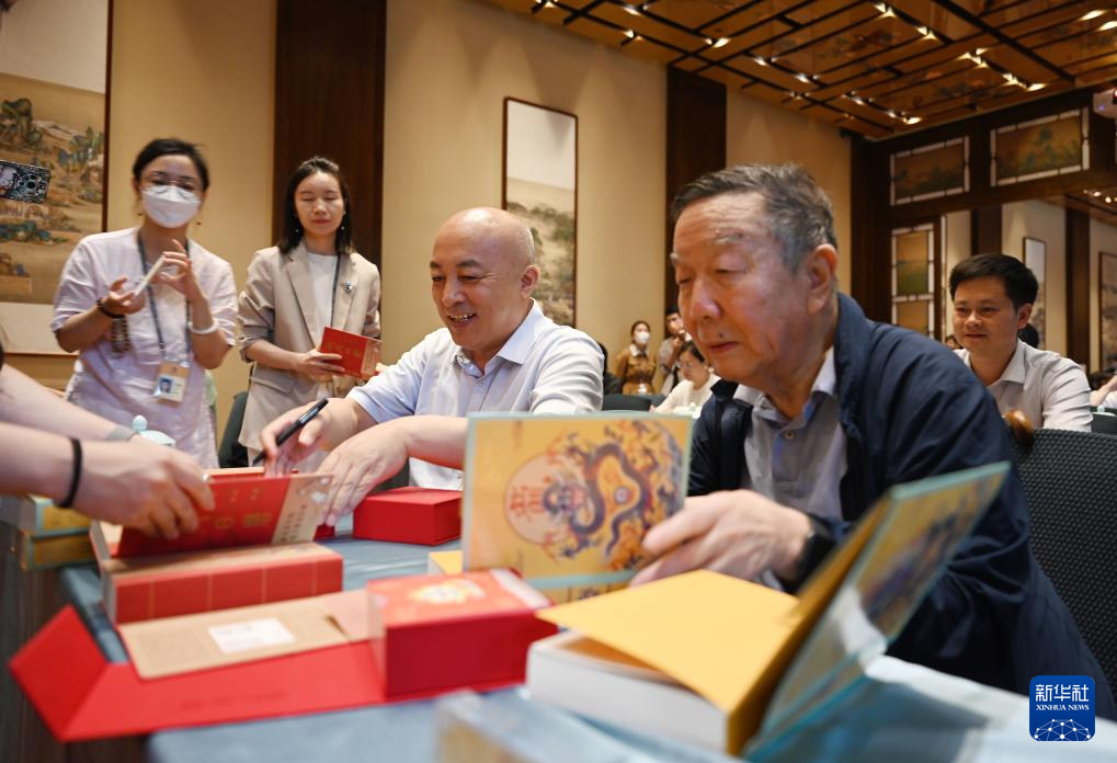 9月19日,故宮博物院院長王旭東(左三)、故宮博物院原院長鄭欣淼(左四)在2024年《故宮日歷》上簽名。