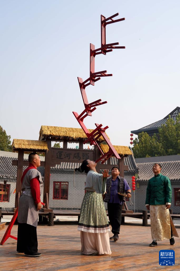 10月17日,雜技演員在吳橋雜技“九月廟會”上表演雜技節目(無人機照片)。