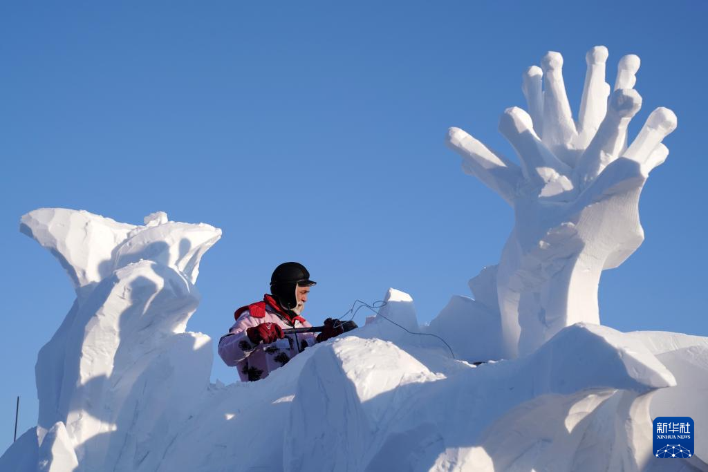 1月7日,選手在哈爾濱太陽島雪博會園區進行雪雕創作。
