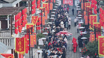 1月6日在上海影視樂園(車墩影視基地)拍攝的電視劇《繁花》中的至真園酒家。樂園復原了劇中的畫面和場景,供游客們沉浸式“打卡”。