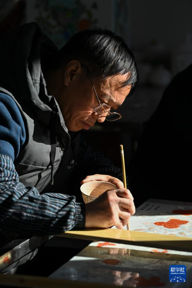 在位于山西省長治市上黨區紅綠彩村的生產基地內,工作人員在瓷器上進行彩繪創作(1月4日攝)。
