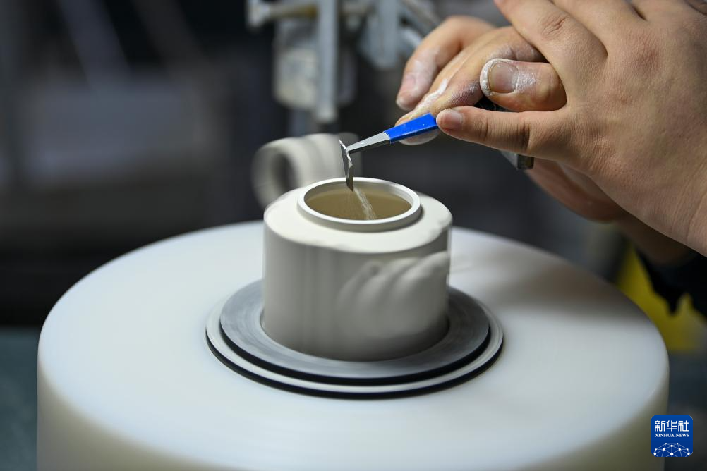 在位于山西省長治市上黨區紅綠彩村的生產基地內,工作人員在進行修坯(1月4日攝)。