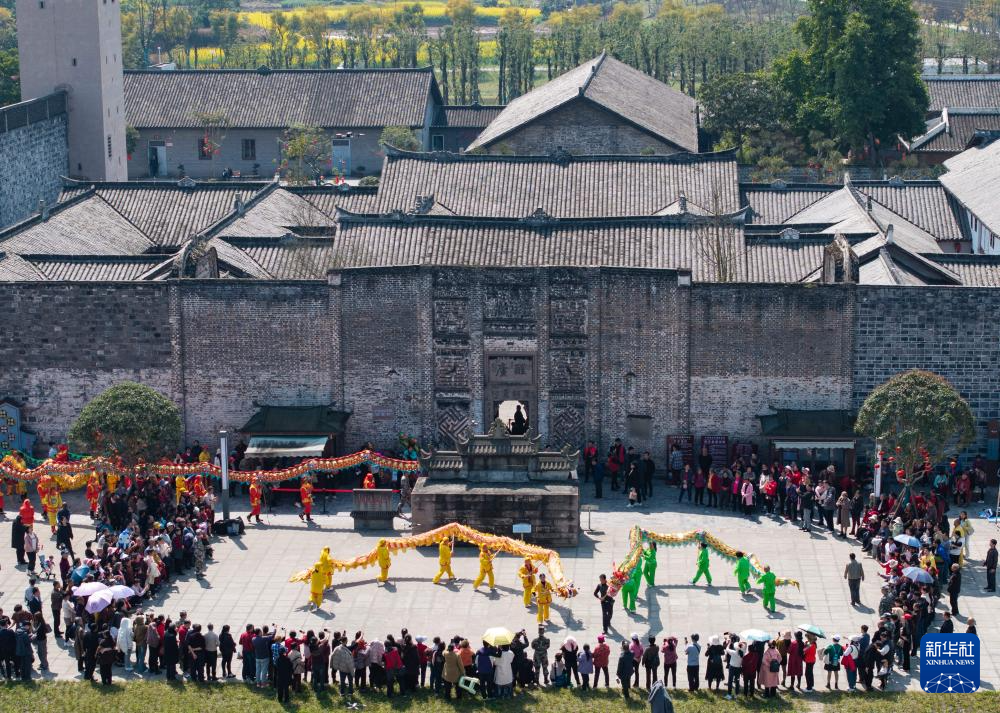 3月11日,在瀘縣屈氏莊園前,彩龍隊進行舞龍表演(無人機照片)。