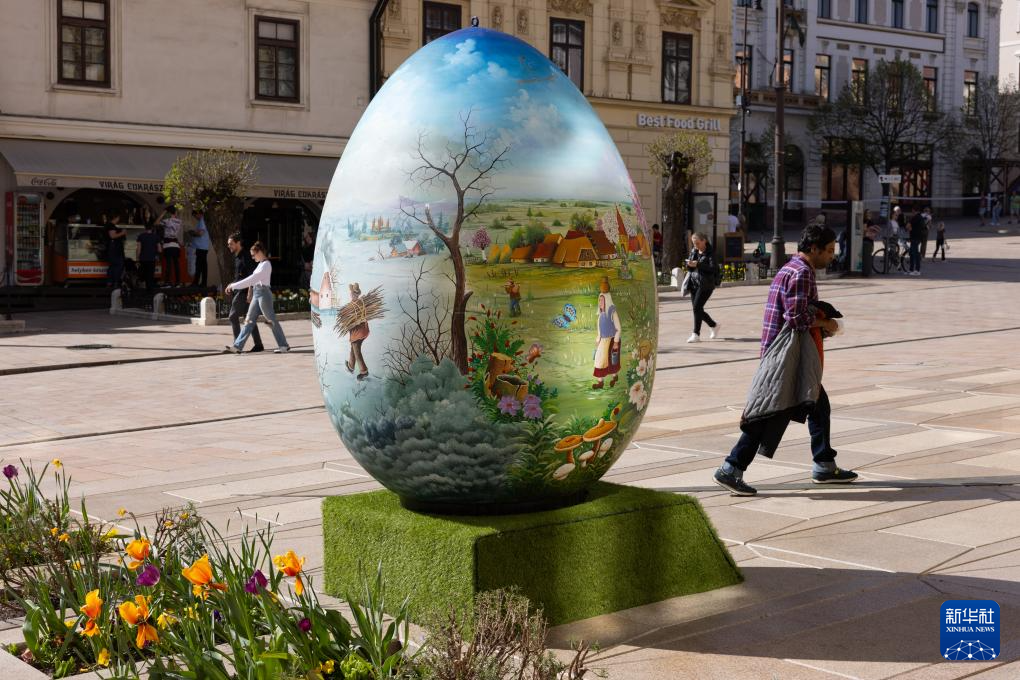 這是3月30日在匈牙利南部城市佩奇街頭拍攝的復活節巨型彩蛋。新華社發(弗爾季·奧蒂洛攝)