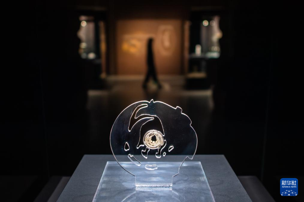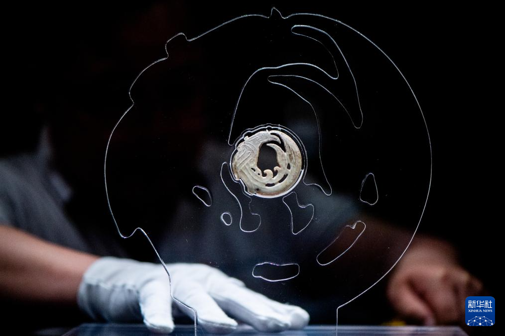 3月30日,工作人員在固定展品玉團鳳。為迎接玉團鳳,武漢盤龍城遺址博物院在玉團鳳展柜上方將燈光布置成玉團鳳形狀。