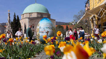 4月6日,李薩(左)在工作室內為顧客介紹蠟染工藝品。