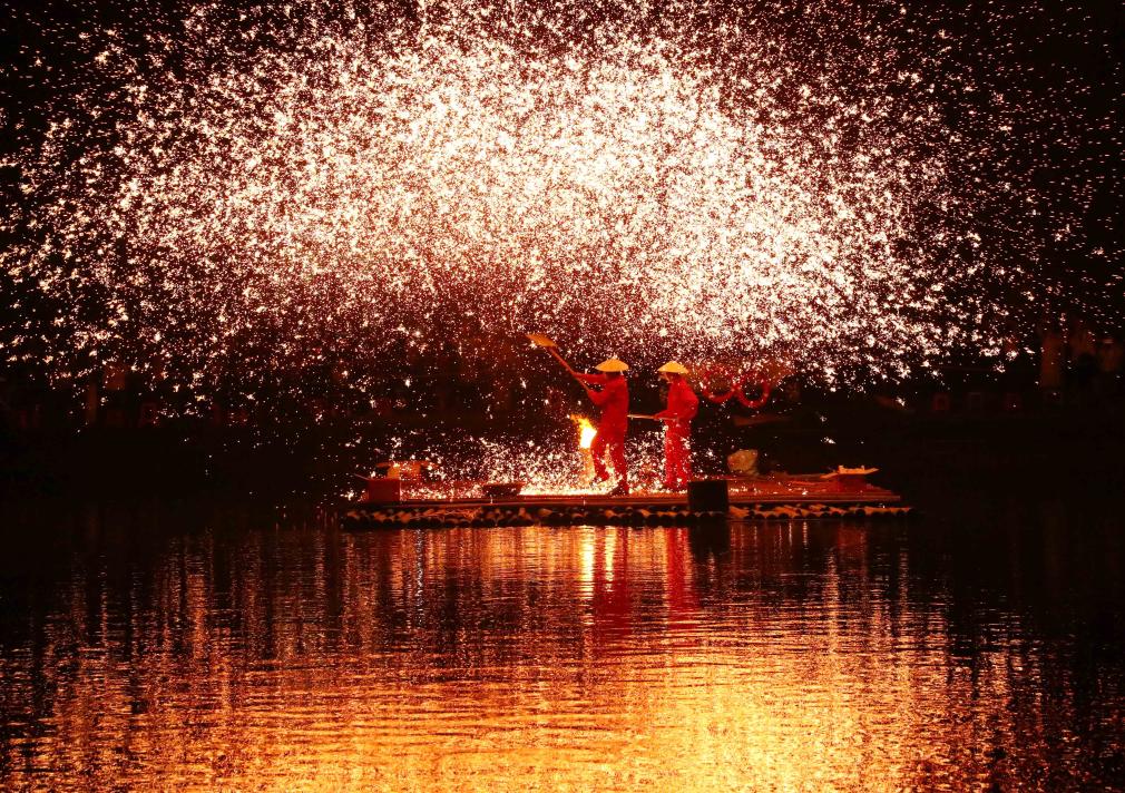 2024年4月8日,廣西壯族自治區柳州市融安縣雅瑤鄉,民間藝人在表演打鐵花。CICPHOTO/韋榮軍 攝
