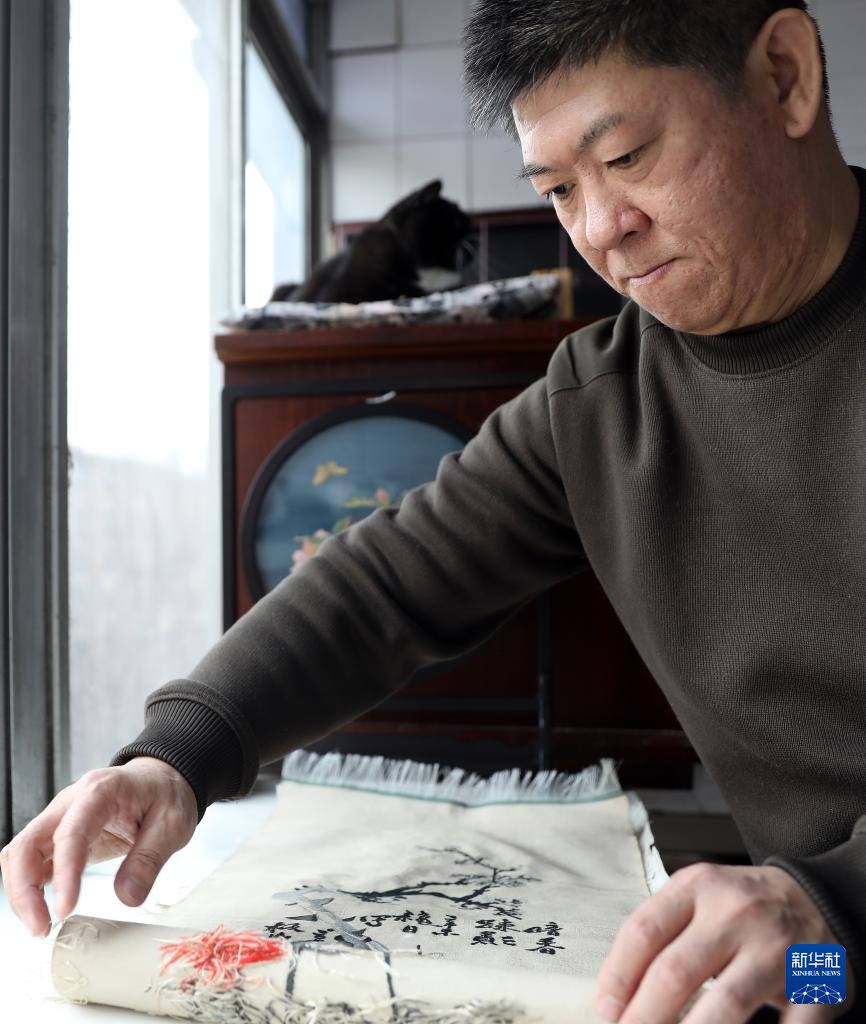 4月9日,申濤在位于營口市的家中對緙絲作品進行最后一道工序——修毛頭。