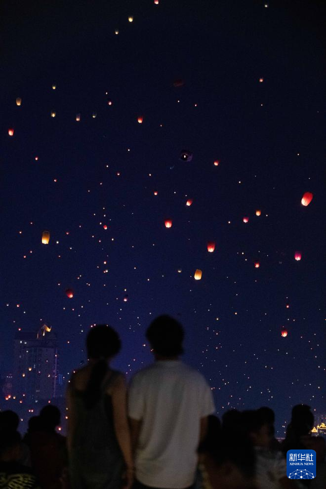 4月13日晚,在云南省西雙版納傣族自治州景洪市,人們在瀾滄江邊放飛孔明燈,慶祝潑水節。