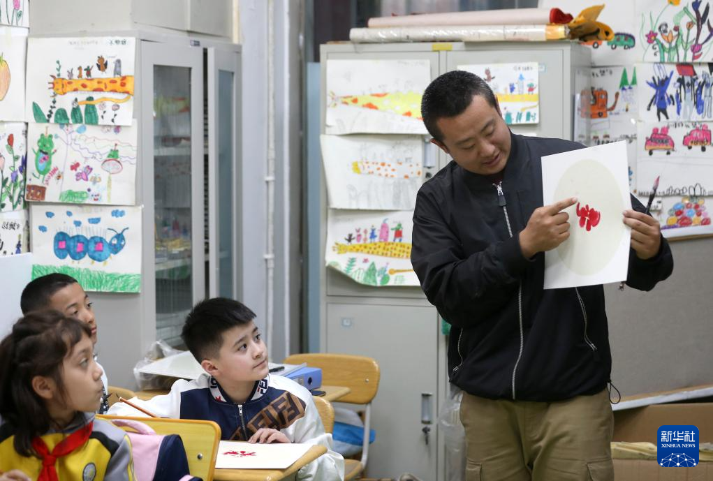4月17日,在烏魯木齊市天山區二道橋街道二道橋社區新時代文明實踐站,當地文聯藝術家為轄區的小朋友講解中國畫繪制花卉的技巧。
