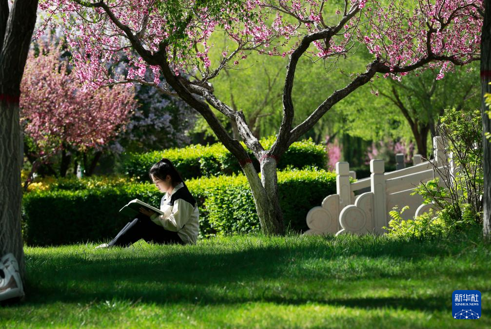 4月23日,一名大學生在甘肅河西學院校園看書。