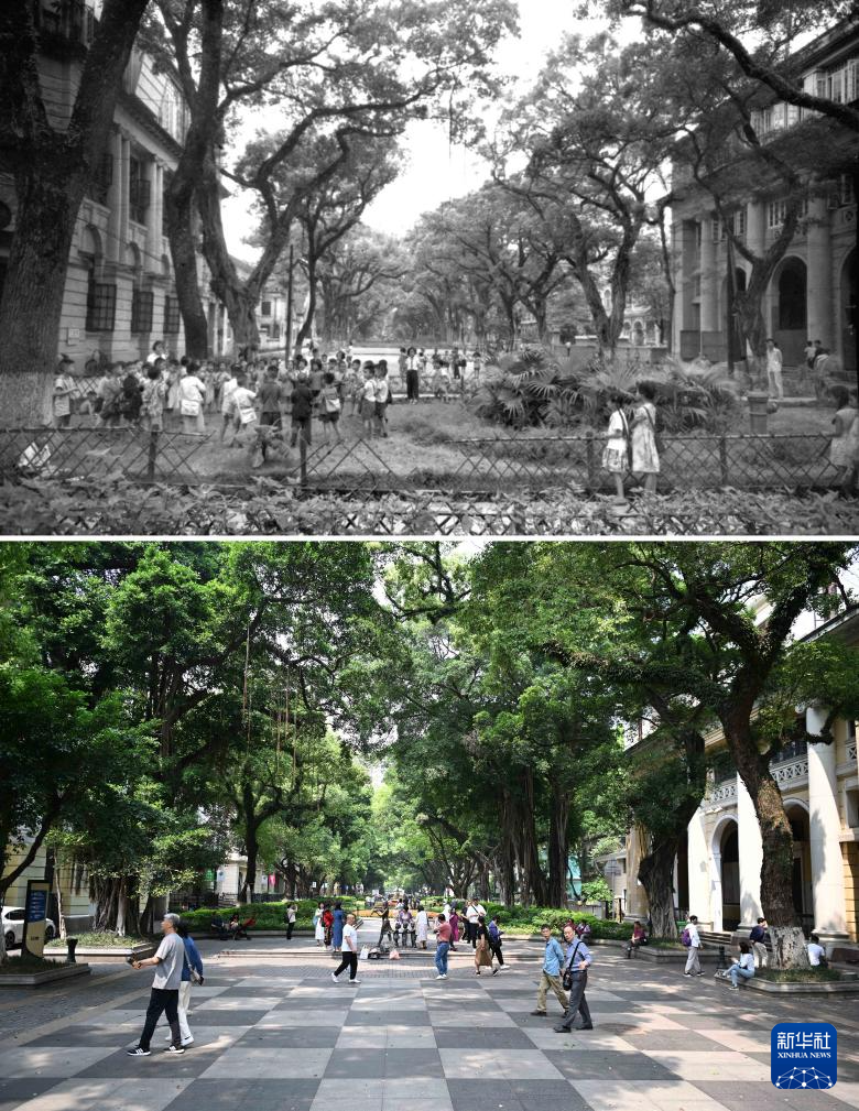 拼版照片:上圖為廣州沙面大街街景(資料照片);下圖為2024年4月11日在同一位置拍攝的廣州沙面大街(新華社記者鄧華攝)。