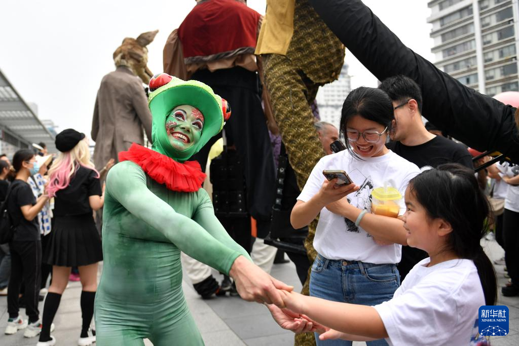 5月7日,在長沙國金中心,觀眾(左)在演出結束后體驗操作大型木偶。