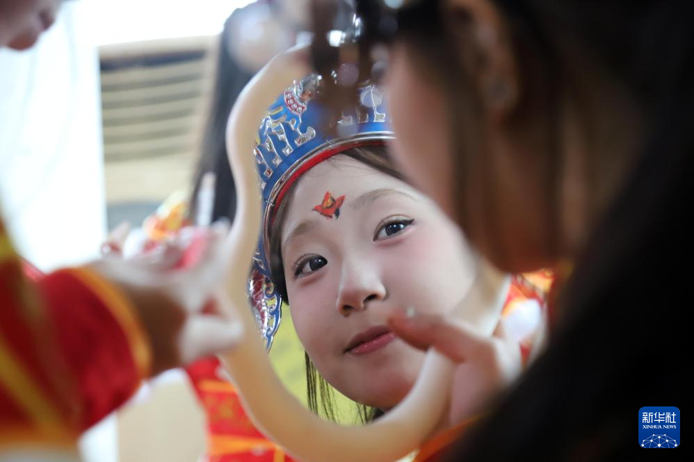 1月29日,英歌隊員在廣東汕頭潮陽區桃園英歌訓練基地穿戴演出服裝。