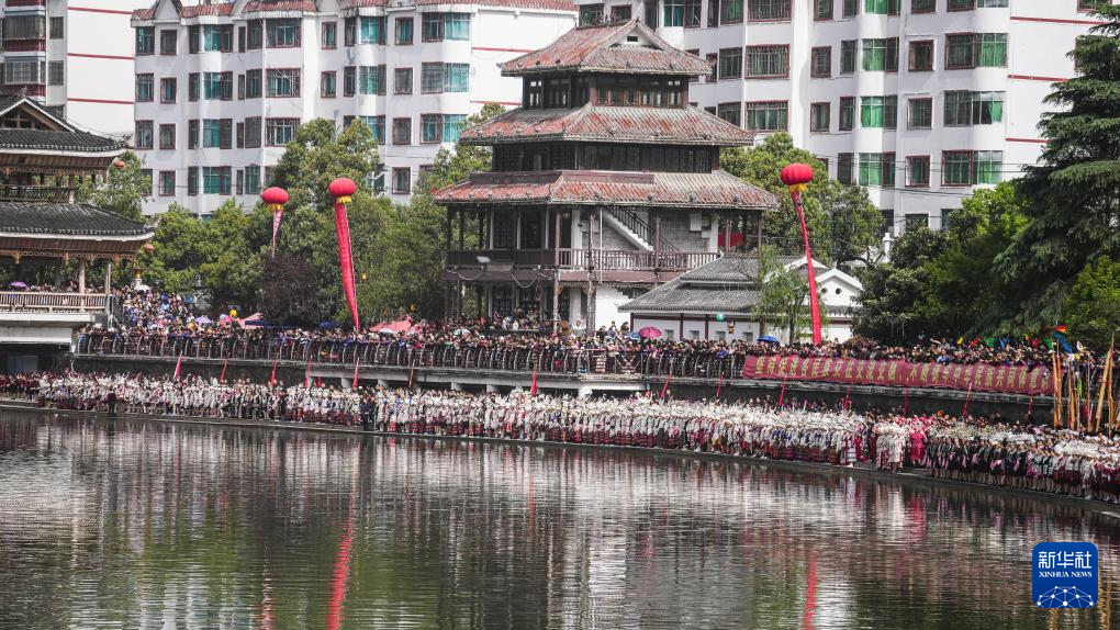 當日,貴州臺江2025年苗族姊妹節苗歌對唱活動在臺江縣翁你河畔舉行。來自臺江縣的萬余名苗族群眾,身著節日盛裝齊聚翁你河畔,以傳統對唱的方式,向游客展現苗族飛歌、情歌,歡慶姊妹節。