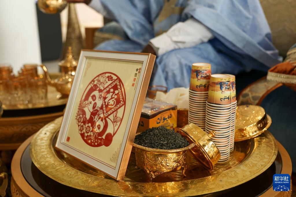 5月9日,在摩洛哥首都拉巴特舉行的“茶和天下·雅集”暨“江西風景獨好”摩洛哥“江西日”活動現場,一件中國剪紙作品被擺放在摩洛哥茶藝表演現場。