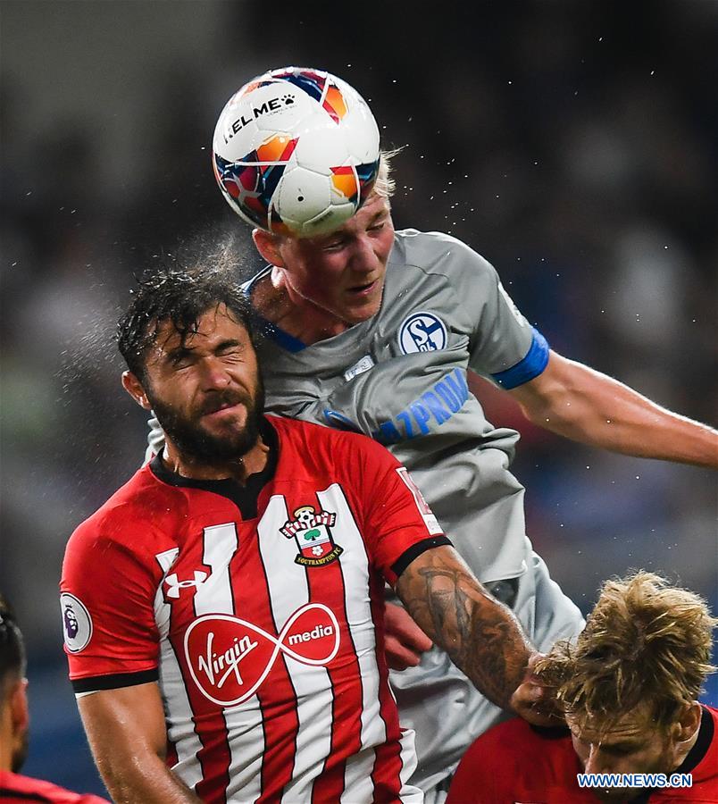 Niklas Wiemann (Top) of Schalke 04 competes during the 2018 Clubs Super Cup soccer match between Schalke 04 and Southampton in Kunshan, east China's Jiangsu Province, July 5, 2018. (Xinhua/Li Xiang)
