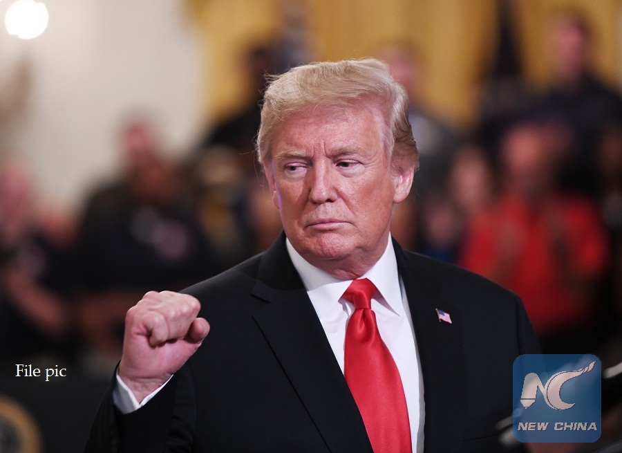 U.S. President Donald Trump makes a gesture during the Pledge to America's Workers event at the White House in Washington, D.C., the United States, on July 19, 2018. U.S. President Donald Trump hosted the Pledge to America's Workers event and signed an Executive Order that establishes a National Council for the American Worker. (Xinhua/Liu Jie)