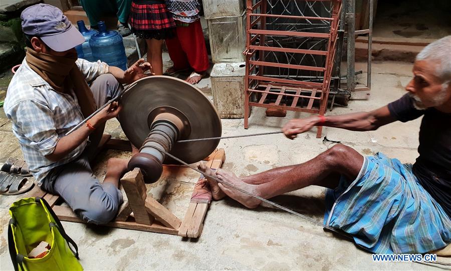 People sharpen the tools for upcoming Durga festival or Dashain festival in Kathmandu, Nepal, Oct. 9, 2018. Hindus in Nepal sacrificed animals during the festival as part of celebrations held throughout the country worshipping Goddess Durga and celebrating the victory over evil.(Xinhua/Sunil Sharma)