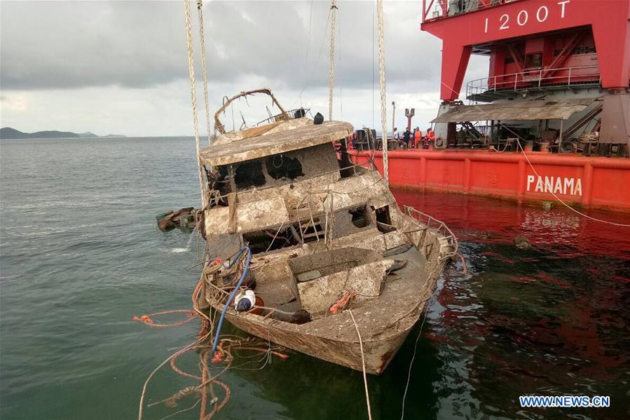 Photo taken on Nov. 17, 2018 shows the retrieving site of capsized tour boat, named Phoenix, near Thailand's southern tourist island Phuket. The tour boat "Phoenix" capsized due to strong winds and high tides off the northeastern part of the island province on July 5. (Xinhua)