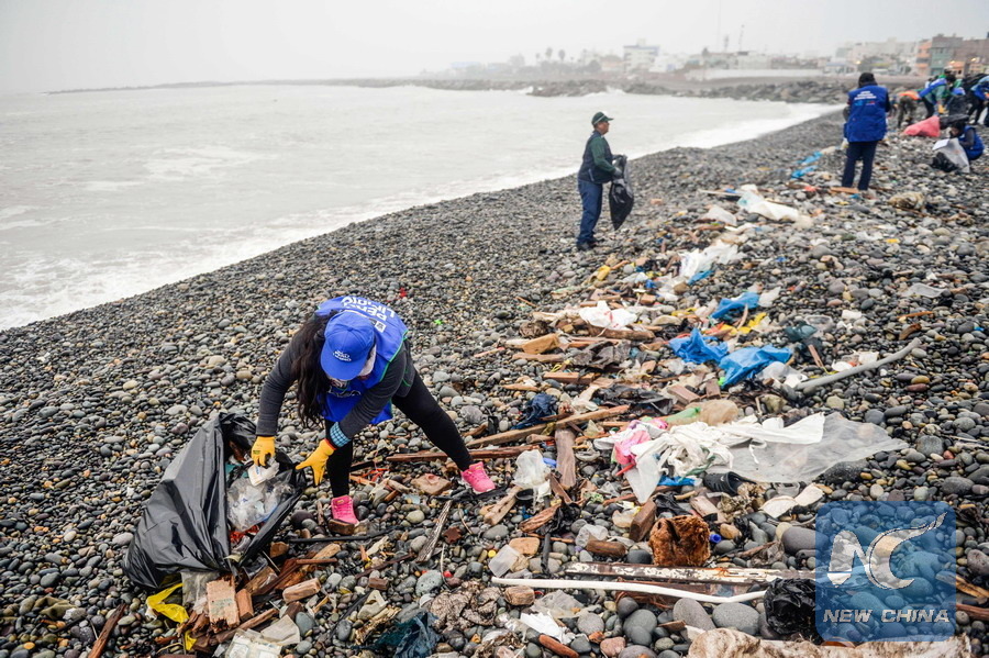 Volunteers clean up plastic waste on a beach in Lima, during the World Environment Day on June 5, 2018. The UN urged to take steps against the use of plastic bags, as part of a global challenge to reduce the increasing pollution of the oceans. (Xinhua/AFP PHOTO)