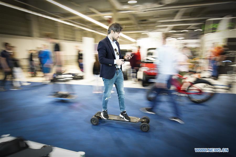 A man is seen trying an electronic mobility device at the Electronics Show in Warsaw, Poland, on May 12, 2019. The Electronics Show in Warsaw, one of the biggest consumer electronics and new technology trade show in Poland, was held here with over 350 exhibitors from across the world. (Xinhua/Jaap Arriens)
