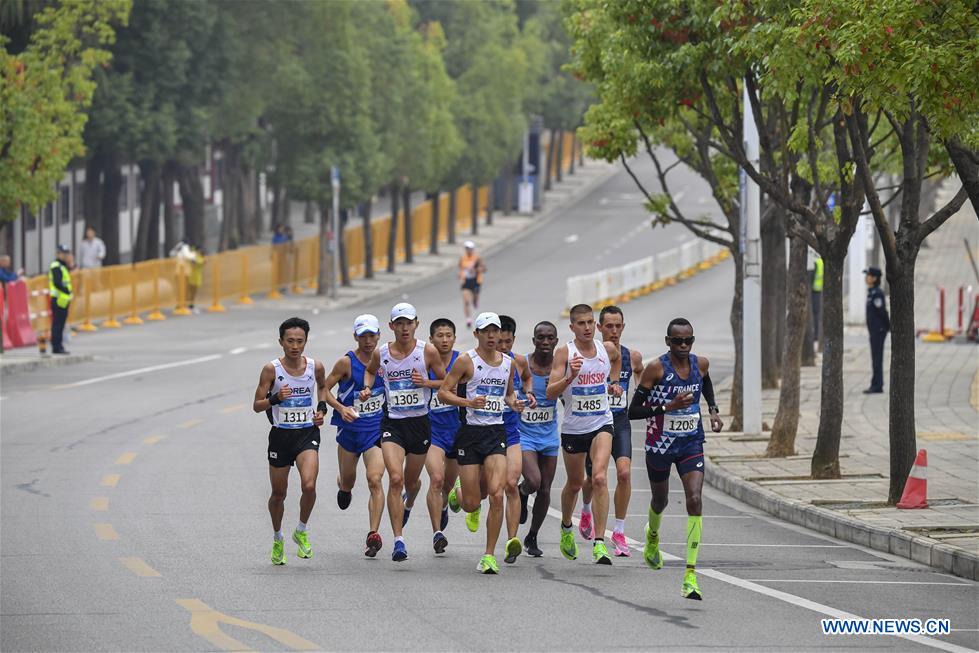 Athletes compete during the men's marathon individual final of track and field at the 7th CISM Military World Games in Wuhan, capital of central China's Hubei Province, Oct. 27, 2019. (Xinhua/Hu Huhu)