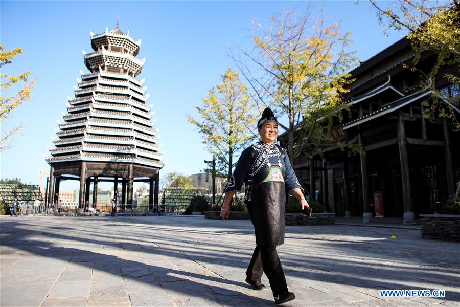 Yang Fang walks past a drum tower in Danzhai County, southwest China's Guizhou Province, Oct. 29, 2019. Batik, a craft inherited through generations among the Miao ethnic group in southwest China's Guizhou, has a history of more than 2,000 years. Danzhai County is a major cradle of the Miao ethnic group's batik craft. Bees wax melting, patterns drawing, indigo dyeing, and fabrics boiling are the main procedures of making batik by local people. The folk artwork is famous for its elegant color, graceful patterns and rich cultural meanings. Yang Fang, 52 years old, learnt the craft when she was 12, and was recognized as the national-level inheritor of the batik of Miao ethnic group in 2018. Through the years, Yang devoted herself into inheriting and promoting the art. In 2004, she opened a cooperative to train local women to master the craft. Her will is to see batik "blooming" among the people of Miao ethnic group. (Xinhua/Ou Dongqu)