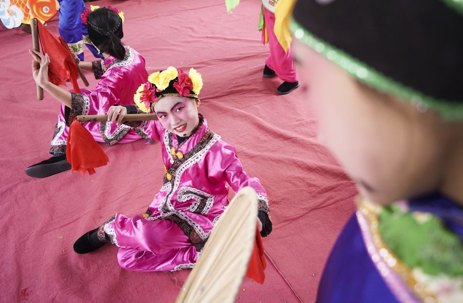 Pupils of the Xiaoyanying Primary School rehearse yangge dance, an officially recognized national intangible cultural heritage, in Luanzhou City of north China's Hebei Province, Dec. 19, 2019. The Xiaoyanying Primary School introduced yangge dance to its campus several years ago and has invited local performers to teach regular classes on this art widely popular in eastern parts of Hebei Province. (Xinhua/Mu Yu)