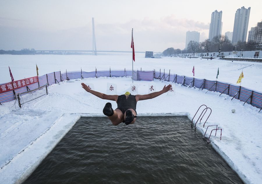 A swimmer jumps into water in Harbin, northeast China's Heilongjiang Province, Dec. 19, 2019. (Photo by Zhang Tao/Xinhua)