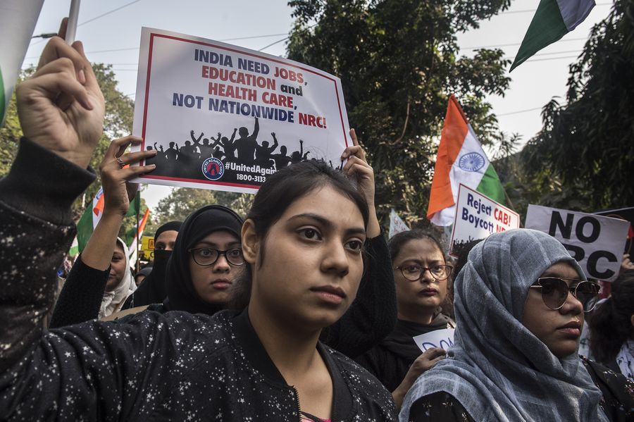 People participate in a protest against the new citizenship law in Kolkata, India, Dec. 19, 2019. Countrywide massive protests against the controversial new citizenship law on Thursday rocked various Indian states, officials said. (Xinhua/Tumpa Mondal)