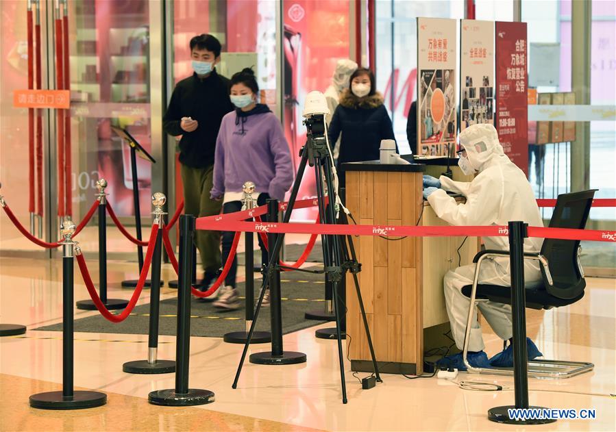 A temperature screening instrument is seen at a shopping mall in Hefei, east China's Anhui Province, March 1, 2020. Some of the shopping malls in Hefei have resumed business after taking necessary protection measures against novel coronavirus. (Photo by Zhou Mu/Xinhua)