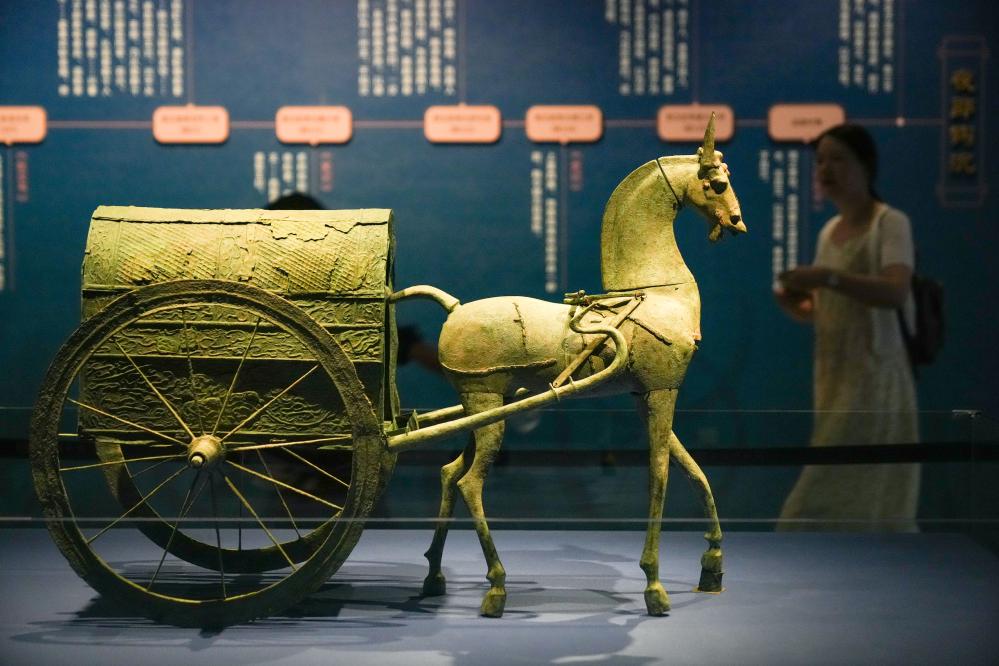 這是5月22日在長沙博物館“夜郎遺蹤——尋找《史記》中的古國”特展上拍攝的展品銅車馬(輜車)(復制件)。