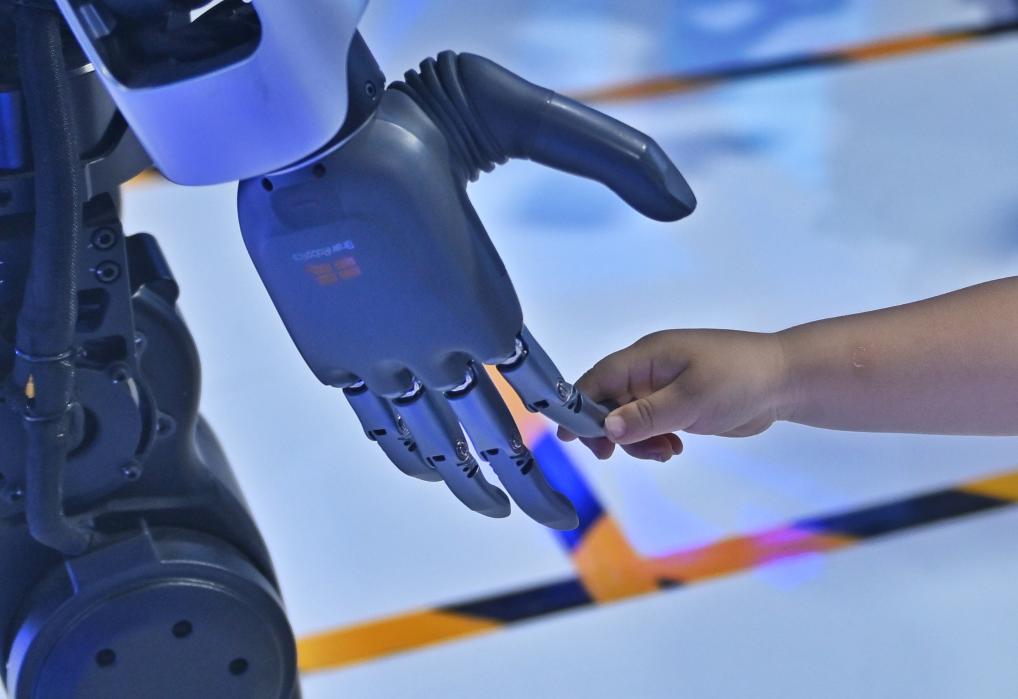 5月25日,一名小朋友在第二十屆中國西部國際博覽會展會現場與機器人互動。