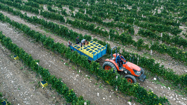 工人在寧夏沃爾豐釀酒葡萄種植基地轉運采摘下的釀酒葡萄(2024年9月19日攝,無人機照片)。新華社記者 王鵬 攝