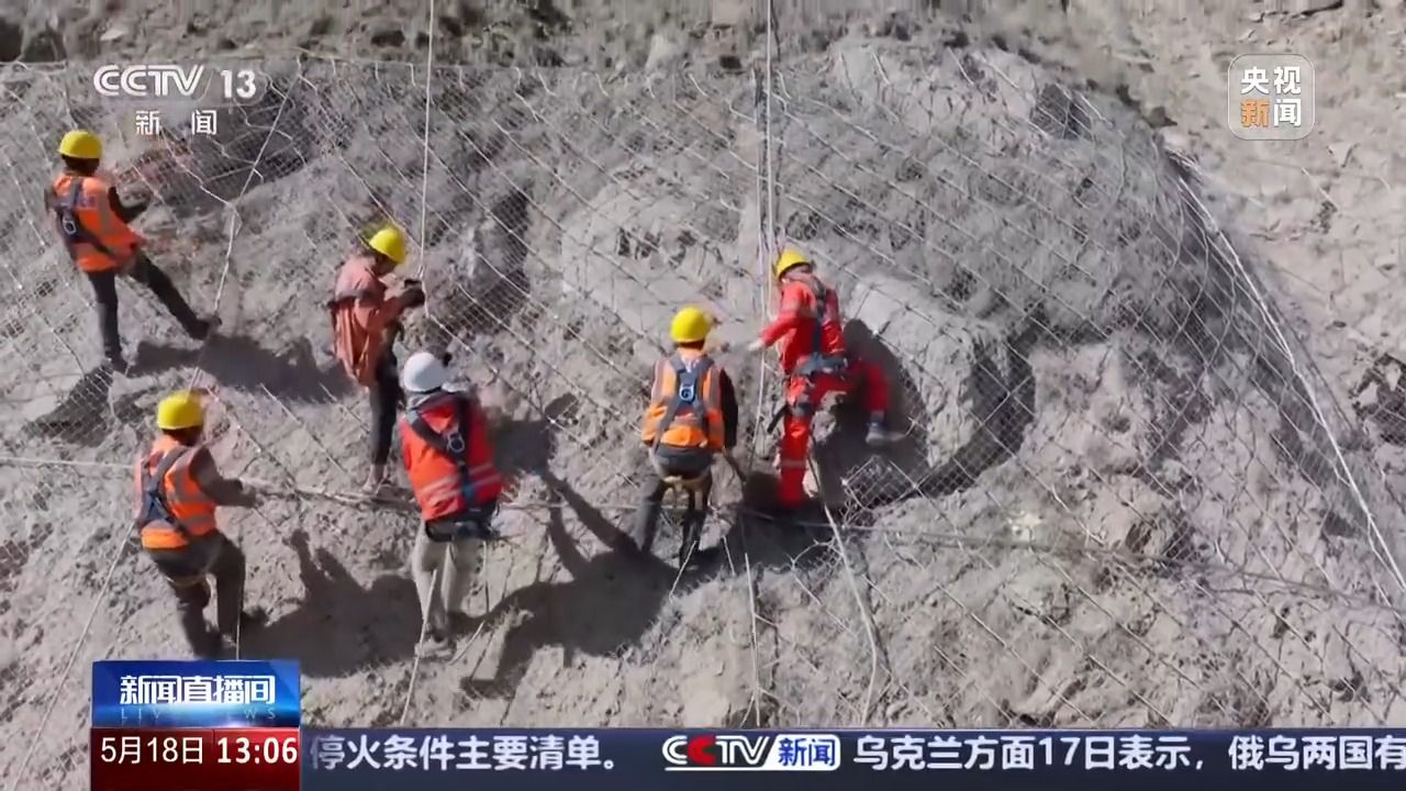 庫車養護所養護工人 亞克甫·克然木:安裝擋石頭的網絲,安裝以后,這個小小的石頭不容易掉下來,就是這樣的石頭,看。這個是最危險的地方,最多石頭掉下來的地方,路上行駛的車輛不安全。