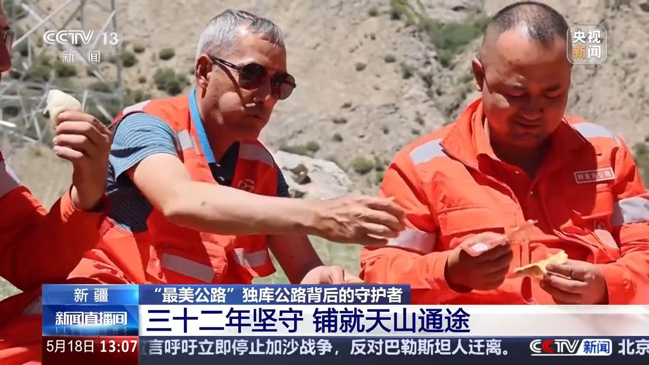 下午兩點多,亞克甫招呼大家停下來吃午飯。這幾天,亞克甫和同事們要搶在獨庫公路通車之前,把冰封了一個冬天的道路養護好。他們經常沒時間回到養護站休整,午飯也只能在路邊對付一下。