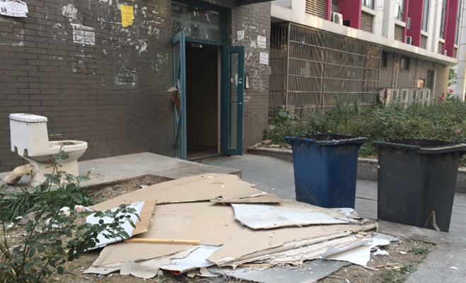 小區內多處雜草密布,生活垃圾和裝修垃圾隨處可見,業主告訴記者,“這些垃圾也沒人清掃,堆在這兒也很長時間了”。