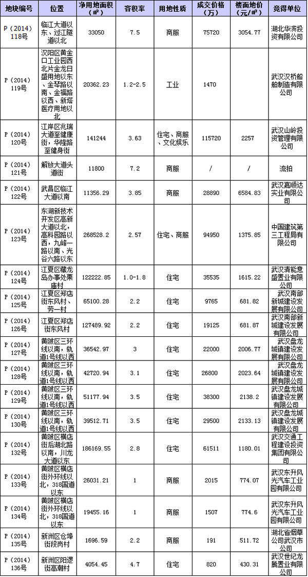 值得注意的是,距離本次土拍僅一個月的10月30日,武漢清能意盛置業有限公司以3.65億元拿下江夏區藏龍島辦事處栗廟村P(2014)114號地塊,凈用地面積12.56萬平方米,土地用途亦為住宅用地,容積率1.0至1.8,樓面地價為1613元/平米。