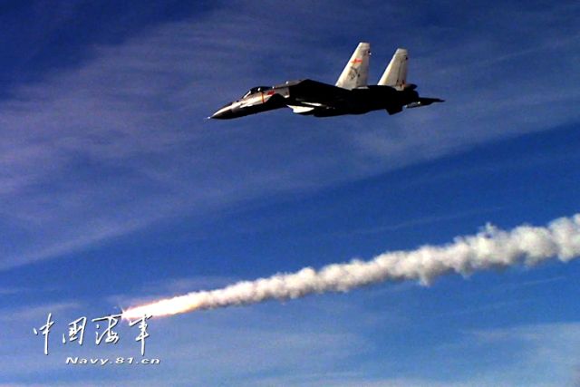 ↑資料照片:殲-15艦載戰斗機發射導彈。