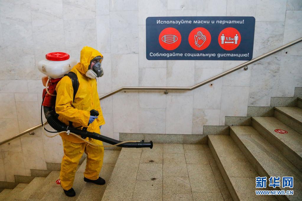 6月24日,工作人員身著防護服在俄羅斯莫斯科一個火車站進行消毒作業。