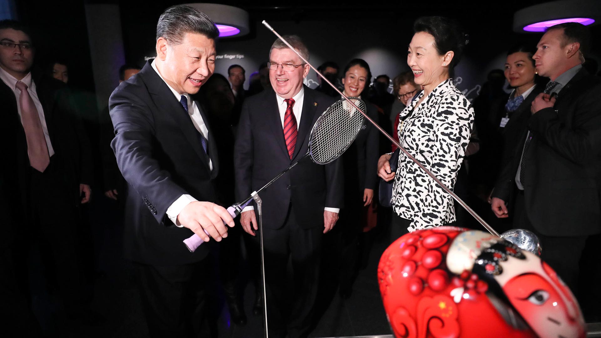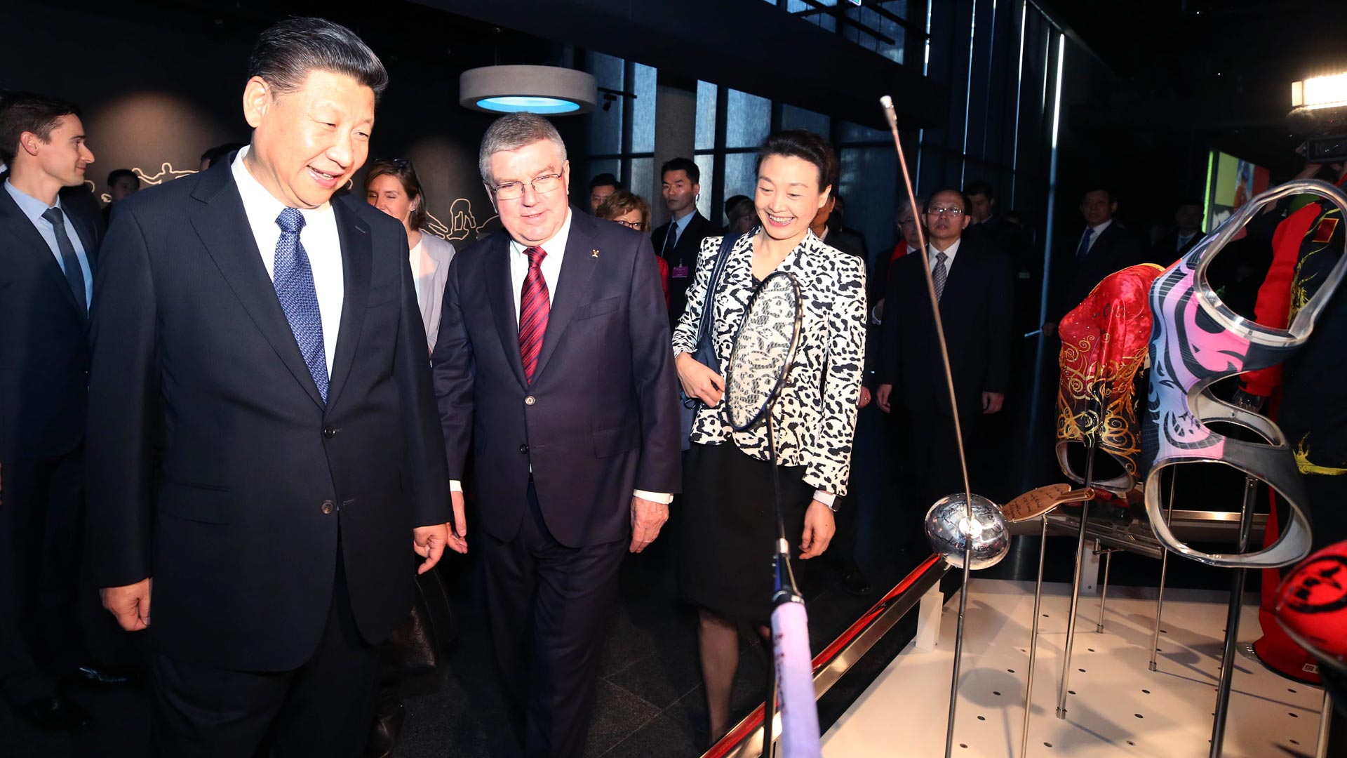 1月18日,國家主席習近平在瑞士洛桑國際奧林匹克博物館會見國際奧林匹克委員會主席巴赫。這是習近平在巴赫陪同下,參觀羽毛球世界冠軍李玲蔚用過的球拍。新華社記者 蘭紅光 攝2017-01-19