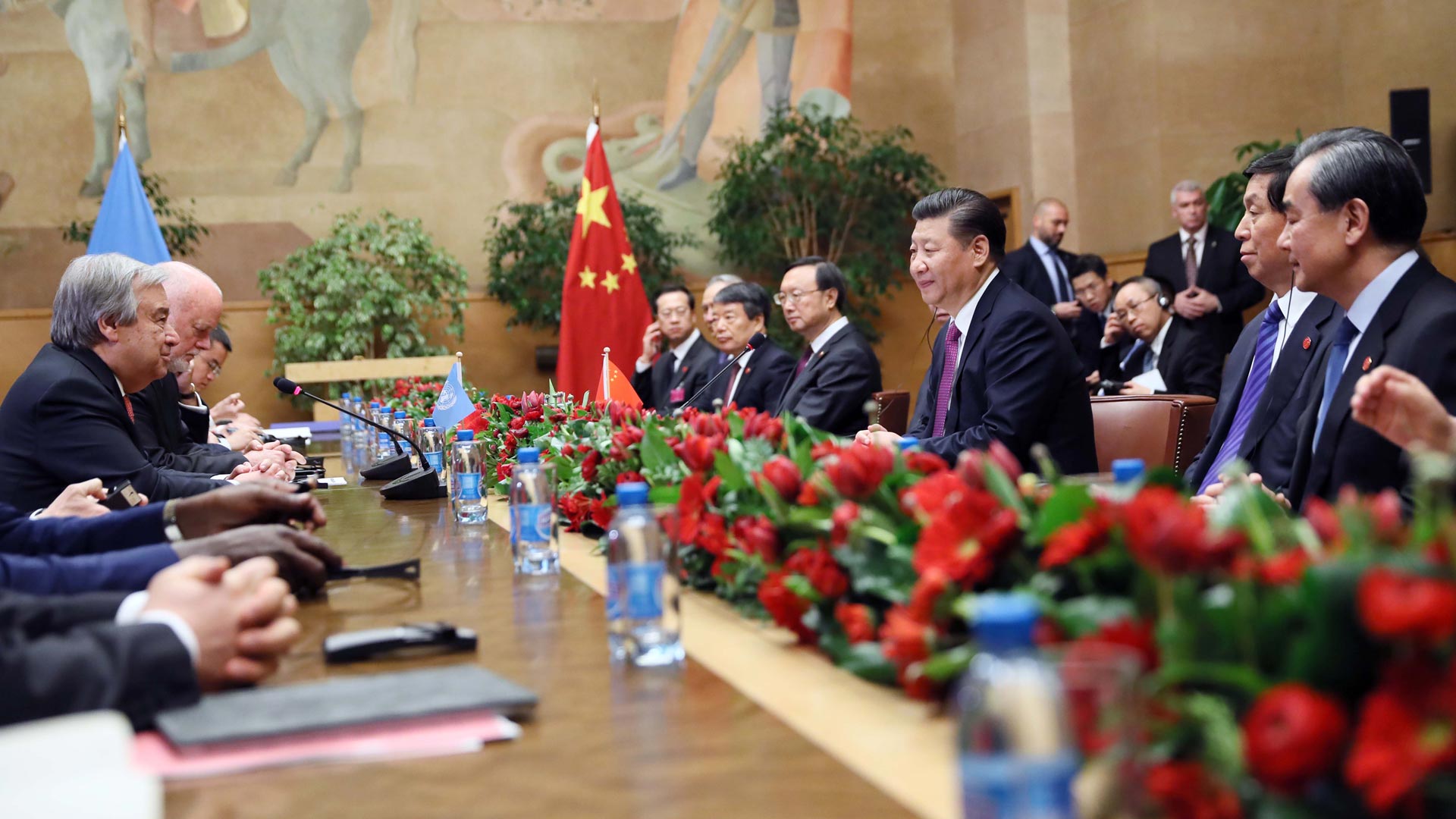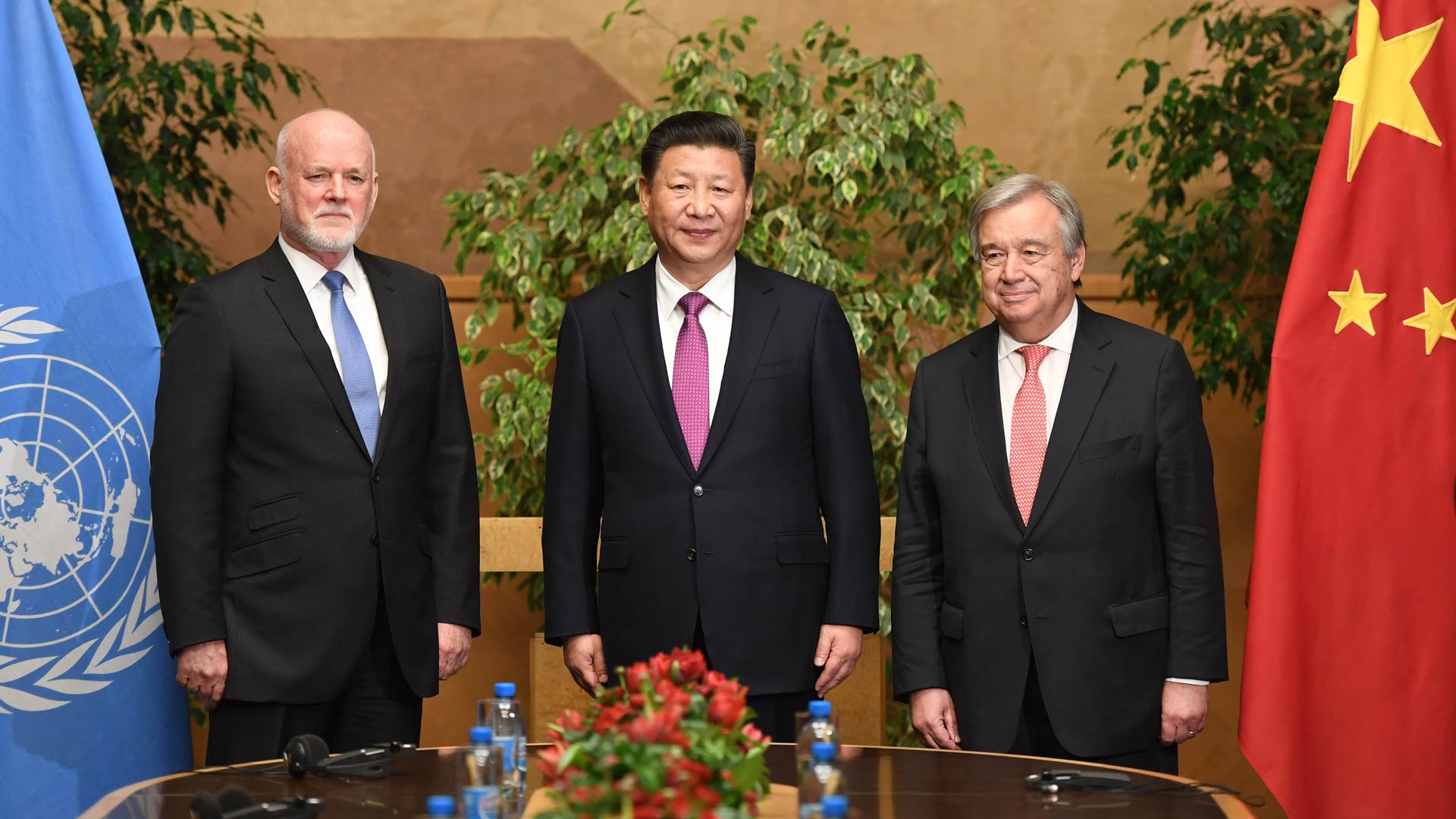 1月18日,國家主席習近平在瑞士日內瓦萬國宮會見第71屆聯合國大會主席湯姆森和聯合國秘書長古特雷斯。 新華社記者 蘭紅光 攝2017-01-19