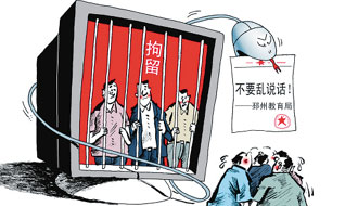 | 江蘇邳州教育局今年8月27日向該市各中小學、民辦學校等機構下發了一個紅頭文件。文件稱,去年以來邳州已有3名教師因在互聯網上散布不實言論被拘留,廣大教師“要注意形象,講政治,講大局,不該做的事不要做、不該說的話不亂說”,文件的真實性得到了邳州市教育局辦公室主任的證實。 |